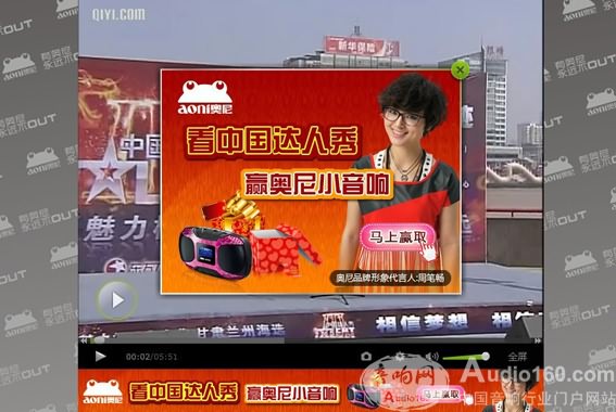 在奇藝中國達人秀第三季專區,除了片頭的15秒視頻廣告,還有視頻暫停插播廣告——“看中國達人秀 贏奧尼小音響”有獎活動。感興趣的網友也可以積極參與,獎品不僅有奧尼小音響,還可以贏取奧尼現金大獎。