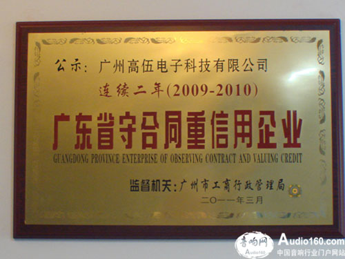 【音響網資訊】近日,廣東省廣州市工商行政管理局召開“守合同重信用”企業表彰會,經過嚴格審核考察,廣州高伍電子科技有限公司已經連續兩年被評為“守合同、重信用”企業。