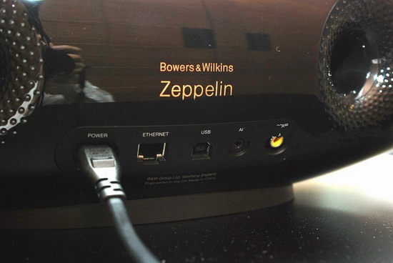 雖然主打無線串流,但B&W也沒有忘記有線的部份,因此背后除了一組以太網絡與USB插孔(也作為韌體升級使用)可與計算機連接外,還有一組AUX(模擬與光纖數)插孔,同時還具有一組RCA輸出。雖然Zeppelin Air僅有一只低音單體,但從照片中可以看到左右兩側各有一個低音反射孔,并采用了B&W使用于800系列旗艦喇叭的Flowport技術,使表面呈現出類似于高爾夫球的凹洞,讓空氣流動更加順暢,減低噪音。