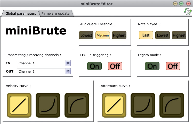 MiniBrute自帶的軟件只有兩頁。第一頁是合成器的設置,可以選擇MIDI通道,選擇三種力度和觸后的曲線,LFO的重新觸鍵的開關,音頻門限預置的三種選擇,三種鍵盤觸發模式的選擇,連音的開關,和琶音器保持模式。還有個力度開關。圖形用戶界面看上去是清晰和直觀的。第二頁是固件升級。