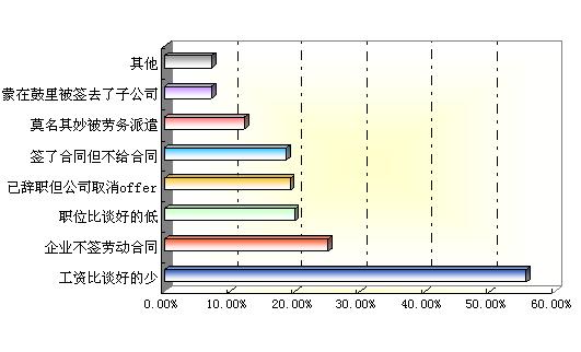 遇到這些情況的職場人不在少數(shù)。根據(jù)前程無憂論壇(bbs.51job.com)日前所作的“你所遭遇過的入職陷阱”(多選)調(diào)查結(jié)果顯示,排在第一位的便是“入職后公司給付的薪水低于面談時(shí)答應(yīng)的薪水”,排在第二位的是“企業(yè)不簽勞動(dòng)合同”,排在第三位的是“入職后職位降低了”,分列第四和第五位的是“已經(jīng)辭職,但公司取消了offer”以及“簽了勞動(dòng)合同卻沒拿到勞動(dòng)合同”(見圖)。