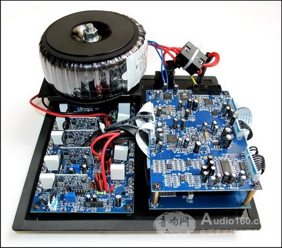 (圖五):這五路音頻功率放大板全部采用獨立的電子元件,以自動貼片焊接工藝獨立成板。獨立電子元器件和各聲道相對獨立的放大電路板,是HI-FI發燒友所公認和青睞的高保真功率放大的好聲保證,也是HI-FI音響發燒友們最津津樂道的話題之一。而自動數控貼片焊接工藝則可大大杜絕漏焊、虛焊,是電子產品穩定性和可靠性的基礎保障。這兩種工藝的運用,其實際聲音效果遠遠超出了許多僅僅使用運放和TDA系列傻瓜功放模塊的所謂高保真多媒體的音質音色,二者效果相差甚遠,實在不具備可比性。