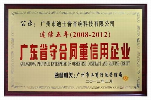 | 前言: 2013年3月,廣州市迪士普音響科技有限公司榮獲由廣州市工商行政管理局頒發的“連續五年(2008-2012)廣東省守合同重信用企業”。 |