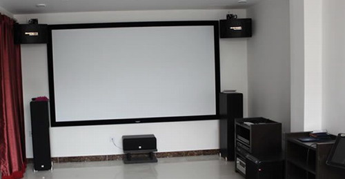 JBL音箱前置音箱全景,幕布采用的是美視大純平120寸!