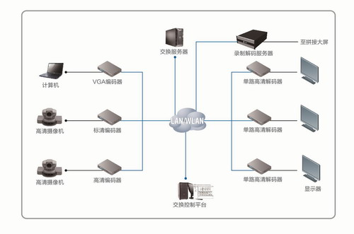整個 IP 網絡交換矩陣系統由編碼器、交換服務器、錄制解碼服務器、單路高清解碼器和矩陣交換控制平臺組成,通過 IP 網絡將整個系統連接在一起,系統還具備同步錄制和回放等功能。