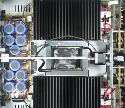 打開機箱內部看,左右聲道一樣分成兩半,內中使用EI變壓器。