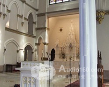 教堂前面講壇左右兩側的柱子上安裝了一對VLS 30 音柱陣列揚聲器。每只揚聲器內置14個垂直排列的 3.5 英寸的低頻傳感器,同時在低頻單元軸線上方還裝有16個1英寸的高頻傳感器,每只揚聲器的最大平均聲壓級為120dB,完全滿足擴聲要求。