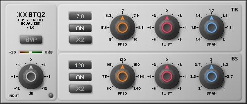 J1000 的 BTQ2 是一個簡單的均衡器,可以使用一對連接的低音和高音旋鈕調整架式和峰值濾波。