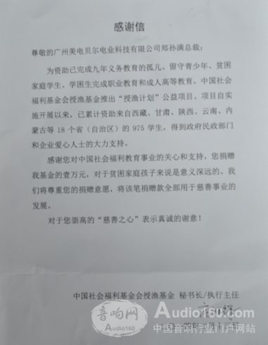 2014年2月,美電貝爾在中國社會福利基金會授漁基金推出“授漁計劃”公益項目中,捐款壹萬元,用以資助孤兒、留守青少年、貧困家庭學生、學困生完成職業教育和成人高等教育。