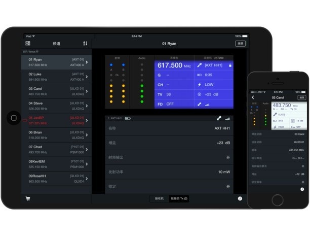 連接到用戶的專用Wi-Fi網絡后,ShurePlus Channels會自動發現相兼容的舒爾硬件,讓用戶能夠遠程查看重要的通道信息,例如射頻信號強度和干擾警報、音頻電平、發射機電池壽命和警報以及其他關鍵指標。與Axient的ShowLink®遠程控制系統配合使用時,ShurePlus Channels允許同時調節發射機和接收機的設置,為這款先進的無線解決方案又增添一項強大功能。 |