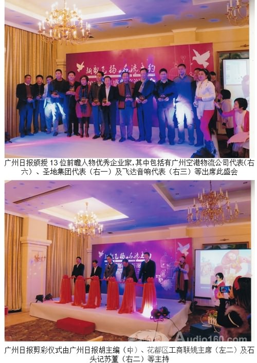 2014年12月28日在廣州市花都區芙蓉嶂山前旅游大道的廣州記者鄉村俱樂部隆重舉行廣州日報·花都社區出版的《前瞻人物》的頒獎儀式,授予飛達音響董事長何歡潮博士2014年度“前瞻人物”獎牌,飛達音響代表參加了此次頒獎儀式。