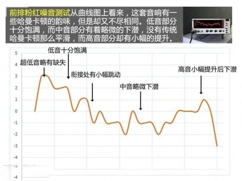 傳統哈曼卡頓音響的粉紅曲線,在中音和高音部分,都是十分平穩的,沒有過多的上下浮動。而我們今天測試的這臺音響,我們看到其在中音部分有了小幅的降低,而高音部分則是在先提升之后在下潛的。所以高音部分的質感應該會有所提升。