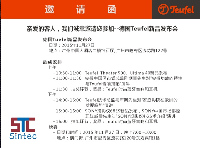 11月27日,深圳先達科將攜手旗下品牌德國Teufel音箱與安橋功放、Sony投影儀和艾麗森沙發(fā)在中國大酒店2樓鉆石廳舉辦新品發(fā)布會,期待您的光臨!