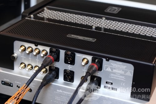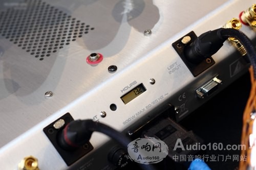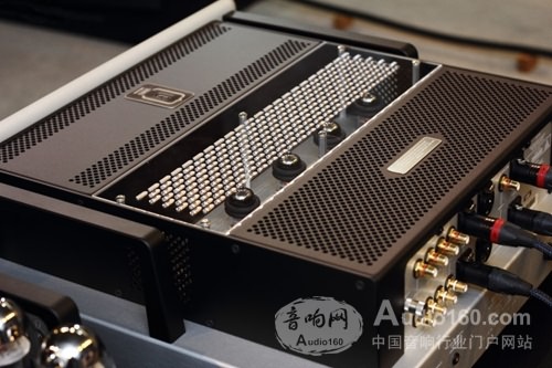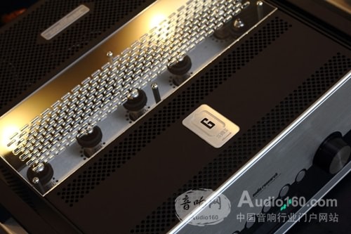GS150最引人注目的肯定是前面板"觀景窗"中,三個隨著使用狀態跳動的指針,我稱他為"觀景窗"應該很貼切,相信每個人在GS150運作時,都會不自覺地盯著他看阿看,表頭和指針的魅力總是可以輕易地征服發燒玩家.GS150在正常使用狀態下,是具有外殼和後方兩個大型風扇散熱器,這次在代理商的試聽室中,將上蓋外殼拿掉了,雖然這樣比較危險,畢竟運作時發出的溫度很驚人,發燒友家中如有小孩肯定別這樣做,但是直接露出內部數只巨大的KT150真空管,散熱不但更快,其吸睛程度更非晶體擴大機可比擬.