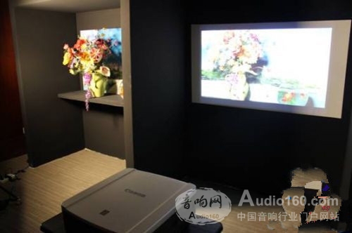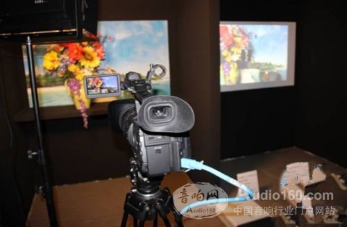 佳能LCOS小型安裝型短焦投影機WUX400ST展示區域,將一臺攝像機實時轉播的一盆花、一缸魚的靜動結合畫面,通過WUX400ST在屏幕上播放。WUX400ST采用的LCOS顯示技術能夠再現平滑流暢的層次與色彩,展示了豐富的色調表現力;WUX400ST具有0.56:1的高投影比,短距離投影畫面不失真,同時投影燈強光也不會干擾演講人員的視線。