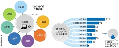 記者統計發現,保守估計,目前已有416家上市公司明顯涉及到了“互聯網+”業務,占到上市公司總數的15%。這其中,既有高新企業,也有身處鋼鐵、水泥等傳統行業的企業。各家公司搭車“互聯網+”的途徑,各不相同。躁動的市場卻回饋給了觸網的公司相同的“大禮包”——股價狂漲、市值倍增。借機推出巨額定增的公司,還“圈到了錢”。
