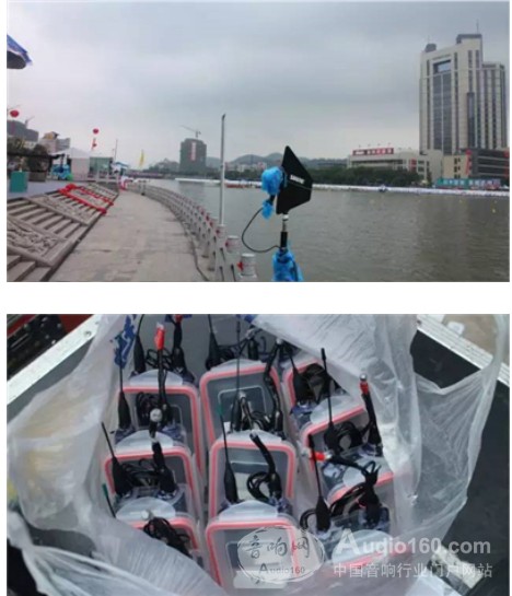 這次擔(dān)當(dāng)重任的天線系統(tǒng),共使用了12只天線做“接力”,比賽用的水道全長(zhǎng)600米,寬約100米,天線沿河岸順次鋪開(kāi)。其中包括10只UA874與2只HA8089,對(duì)于腰包發(fā)射機(jī),舒爾做了防水處理。有如此保護(hù),綿綿煙雨反倒給賽場(chǎng)上增添了更多韻味。