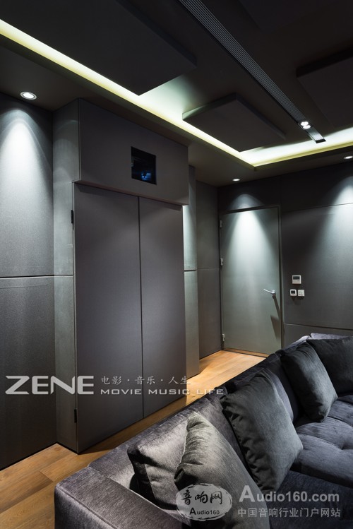 從照片可以看出這間影院的極致簡約,裝修出自臺灣獨立設計師之手。他以居住者的角度揣摩,結合對色調、材質、比例與燈光的感知力,致力達到視覺整體的協調性。這位設計師一年只接一兩個設計,而且一單沒完工是絕不接下一單的,為了室內裝修業主等了他將近一年。這么大費周折完成的家居設計和裝飾,者尼在設計時首要保證整體家裝的一致美感。所以這間影院做成全隱藏式主題,配色沿用家裝設計。而且為了滿足業主的極致追求,在使用了專業隔音門之后,外加一道與其他房間相同的門,聲學美學兩不誤,魚和熊掌就這樣愉快地兼顧了。