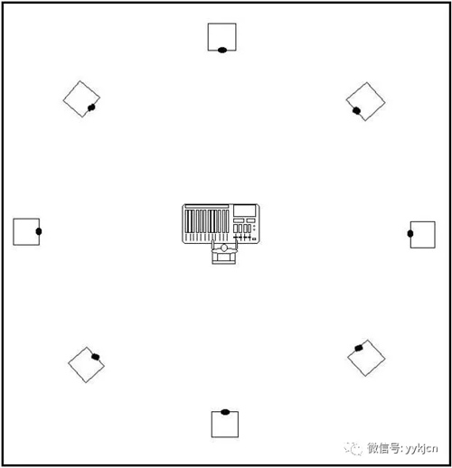 電聲音樂學會前主席、伊利諾伊大學實驗音樂工作室總監、音樂創作名譽教授Scott A. Wyatt也指出,八聲道系統除了BEAST主八聲道配置,還有兩種布局方式:第一種是揚聲器圍繞聽眾形成一個圓圈的圓形八聲道揚聲器陣列,另一種是形成一個矩形陣列的矩形八聲道揚聲器陣列。圓形八聲道揚聲器陣列(見圖5)最大的優點是,對于單聲道聲源,僅僅通過控制聲像電位器就能控制用哪一只揚聲器構建聲像,而無需顧慮立體聲聲像的問題。