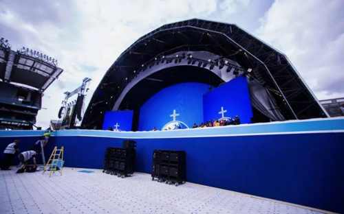 在體育場的地面,4組12只STM M28延時線陣音箱,通過NEXO通用放大機柜提供驅動。所有音箱擴聲由NeMo遙控。家庭節(jié)是第一個完全受益于克羅克公園新擴聲能力的活動,將活動擴聲與體育場的固定擴聲結合為體育場的所有最高層提供聲壓覆蓋。超過150只NEXO GEO S12-ST線陣列音箱分布在體育場的懸垂屋頂上,由Mongey通信公司今年夏天安裝,作為升級體育場技術設施的一部分。事實上,安裝期限是由體育場老板蓋爾協(xié)會提出的,專門處理教皇的訪問。