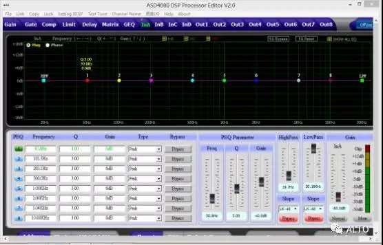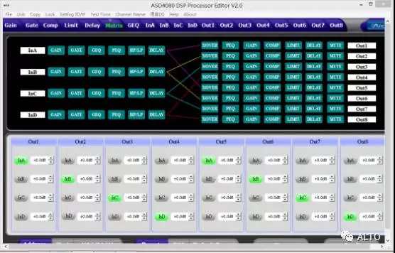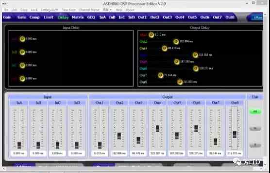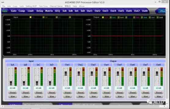 8路輸出處理部分包含分頻,9個參量均衡,增益,靜音,壓縮器,限幅器,相位,延時,連動調節等處理單元。