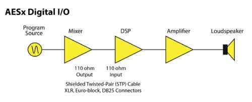 和模擬相似,AESx是輸出和輸入之間的單向連接。AESx允許使用平衡式模擬電纜和接頭,大多采用帶XLR公頭輸出驅動和XLR母頭輸入的屏蔽雙絞線。電纜較短時(< 30 m),同一根電纜也可用于平衡式模擬接口。專為數字I/O而設計的低電容電纜可以延長到100 m。因為場地規格不同,布線的長度也會有差異。還有其它的電纜選項,如同軸線(AES3id ——其實就是一種視頻接口)以及類電纜(如超5類電纜)。AESx標準也適用于使用小體積DB25接頭的多對線(多達16個通道)。具體采用哪種電纜取決于不同產品,并且相互轉換時會相應使用不同的方法。制造商會根據產品的目標市場決定具體規格。