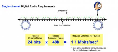 圖5 – 采樣率和位深可以用數位流的數據傳輸速率表示。數位流相當于組成數字信號的“0”和“1”的傳輸帶。AESx數字音頻包括兩個通道,數據傳輸速率約為6 Mbps。