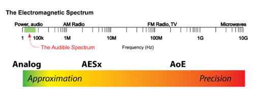 模擬音頻信號一旦數字化,就成了數據。科技發展為電腦間傳輸數據提供了許多途徑,應用最廣的一種就是以太網網絡。通過以太網傳輸音頻(AoE),開創了低成本、普遍化數據網絡傳輸音頻數據的新時代。AESx及其類似的標準或協議由音頻行業所制定,但是AoE是利用信息技術(IT)行業的技術來傳輸音頻的。