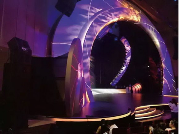 為了不影響到舞美視覺效果,舞臺臺口中央設置了2只ESD 6作為臺唇補聲。