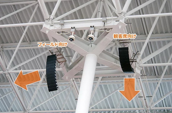 南看臺的室外用可變擴散陣列揚聲器HX-5。1臺或者2臺連接,和BS-1020B組合后,用來傳遞清晰的聲音。