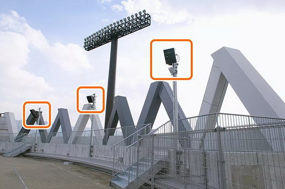使用3臺連接組合的防滴型可變擴散陣列揚聲器HX-7,為觀眾席和賽場上提供聲音清晰的高品質音響廣播環境。
