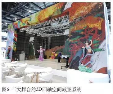 工大舞臺的展臺面積達到216 ㎡,為歷年之最,展臺的設計也獨辟蹊徑,突出體現了甘肅文化特色,把甘肅文化中的突出代表——敦煌莫高窟元素、大地灣彩陶文化呈現給廣大觀眾,有耳目一新的直觀感受(見圖6)。工大舞臺展出了3D四軸空間威亞系統、軌道飛行器以及平移、升降、旋轉吊掛系統等三項產品,體現了工大舞臺近幾年在技術研發上的成果。