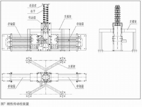首域介紹了新研制的剛性傳動柱裝置,其結合了柔性轉動柱和拉鏈機構的拉起和解開技術,在沒有導向的情況下可直接頂起載荷,可承受規定的任何方向的水平載荷。