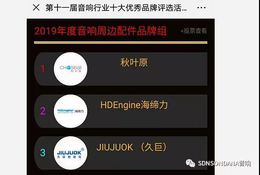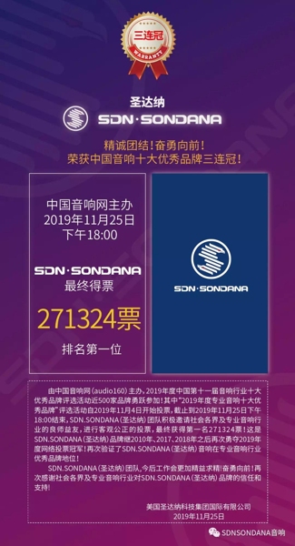 由中國音響網(audio160)主辦,2019年度中國第十一屆音響行業十大優秀品牌評選活動近500家品牌勇躍參加!其中“2019年度專業音響十大優秀品牌”評選活動自2019年11月4日開始投票,截止到2019年11月25日下午18:00結束,SDN.SONDANA(圣達納)團隊積極邀請社會各界及專業音響行業的良師益友,進行客觀公正的投票,最終獲得271324票!排名第一名!這是SDN.SONDANA(圣達納)品牌繼2010年、2017、2018年之后再次勇奪2019年度網絡投票冠軍!再次驗證了SDN.SONDANA(圣達納)音響在專業音響行業優秀品牌地位!