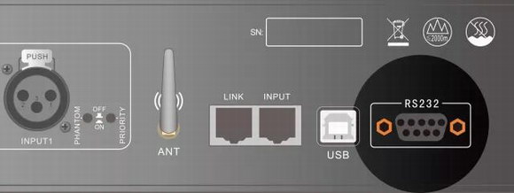 后背板 配置一個RS-232接口,提供串口數據中控連接功能 ,可連接 CRESTRON 、AMX等第三方中控設備,進行待機/開機、靜音、音量加減控制。