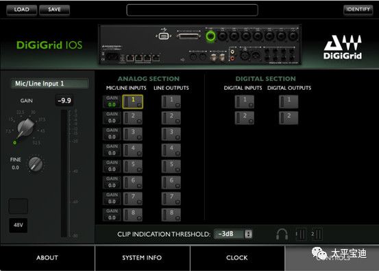對(duì)IOS-XL麥克風(fēng)話筒放大器的控制均由SoundGrid Studio軟件完成,SoundGrid需要安裝在與其連接的電腦上。SoundGrid的麥克風(fēng)輸入部分可選擇48V幻象供電,并有兩個(gè)用于控制增益的旋鈕,一個(gè)以7.5dB的步幅調(diào)節(jié),另一個(gè)則可提供高達(dá)7dB的精細(xì)控制。八個(gè)模擬輸入中的每個(gè)輸入均可通過背面的XLR / TRS插孔用作麥克風(fēng)或線路輸入。IOS-XL的話筒放大器和耳機(jī)放大器與DiGiCo SD7調(diào)音臺(tái)中使用的話放和耳放相同。