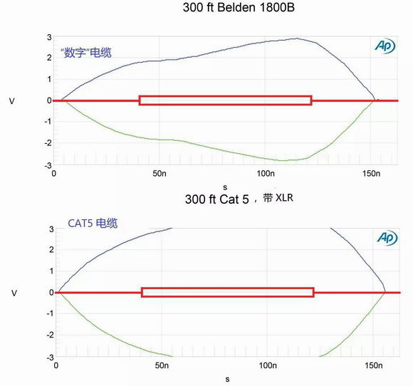電纜電容引起的高頻丟失通常讓數字波形的銳邊變得圓滑。在一般情況下,這種修改不會影響信號所攜帶的信息,因為零或一實際上由轉換或者零交點所決定。也就是說,數字信號比模擬信號更不容易遭受電線的“侵蝕”,因為數字信號不是音頻,而是數據。這是數字音頻優于模擬音頻的重要特征。
