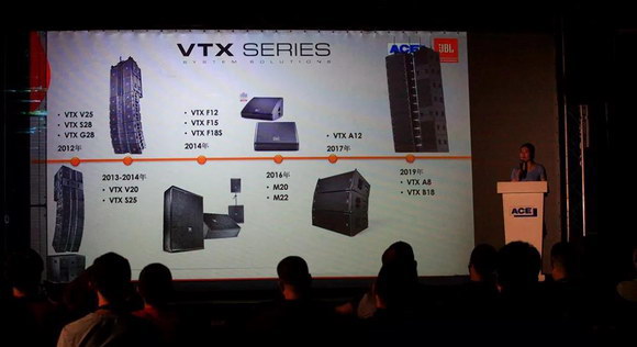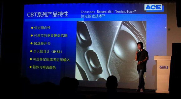 ACE朱鵬亮講解JBL CBT系列、VRX900系列和SRX800系列產品特性、系統配置、案例應用及現場試聽。