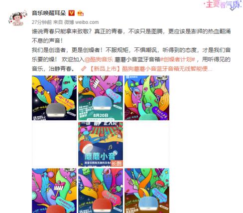 8月19日,酷狗音樂新潮產品酷狗蘑蘑小音藍牙音箱在天貓首發正式開售。作為跨界數碼硬件的新晉潮牌,經過近兩年一系列爆款耳機音響口碑沉淀,其新品同樣因為新潮、好玩、有特色而受到各方面的關注,一上市即獲到了眾多大V種草響應。從種草內容看,這酷狗藍牙小音箱還是一款還情感的產品,不僅顏值、功能上有趣好玩,伴隨其上市一呼百應的#創燥者計劃#“我們大聲思考,讓萬物有聲”更是喊出了年輕人的聲音。