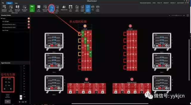 系統工程師在移交擴聲系統給調音師之前,需保證系統內所有設備全部正常工作。PM軟件在調試(工程師)模式下,內置White(白噪)、Pink(粉噪)、Sine(單頻)信號發生器,可提供對系統所有設備和元件測試功能:對整個系統所有設備或單獨揚聲器單元逐一測試、核對功率放大器通道與揚聲器單元(高頻、中頻、低頻)的匹配是否有誤、線纜是否有虛接、揚聲器單元阻抗值顯示等,如圖1。工程師模式能大幅提高系統搭建的工作效率,且能快速判定故障所在位置。