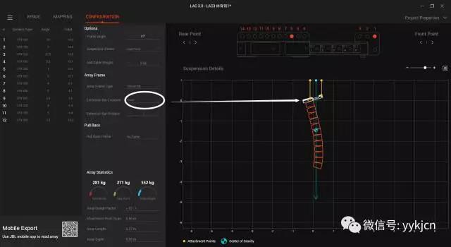 另外,在調整揚聲器組整體角度時需注意揚聲器吊架的吊掛點位置,保證揚聲器組的重心在兩個吊掛點之內且兩個吊掛點的承重相近,如吊掛圖出現“無效重心位置 ”(如圖7)或“某一吊點承重超過負荷”則需要重新調整,以保證系統的安全性。如果此揚聲器組的覆蓋角度和吊掛高度能獲得最佳的頻響曲線,則可以使用吊架反裝方式吊掛,如圖8,以保證最佳的頻率響應。JBL線陣列AF吊架都能使用反裝方式吊掛,并配備后拉架,以適應不同演出場的苛刻需求。