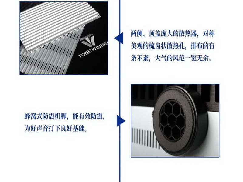 兩側和頂部均為梳齒狀蓋板,上面有條不紊地排布著散熱孔,加大散熱速率,同時梳齒狀設計讓整個機身簡潔而不單調,增加了整體造型的美感。底部有蜂窩式防震機腳,能有效減緩機身震動,為好聲音打下良好基礎。