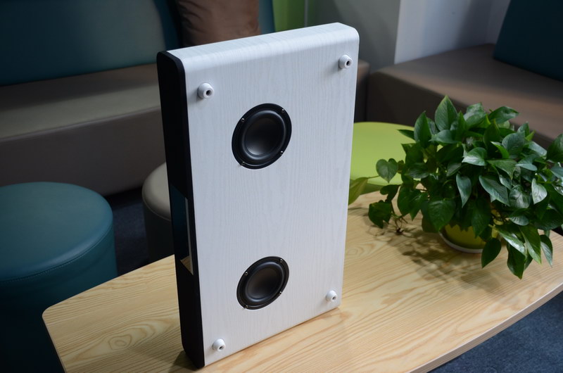 音箱底部為左右對稱的兩只4寸長沖程低音揚聲器,這種無指向性的設計能讓低頻通過放置平面的反射360度輻射出去,這樣不論你從哪個角度都可以聽到他的聲音。