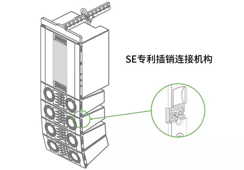 L35線陣單元有一個內置的雙向開關,當使用四芯線纜時,用戶可以在兩個輸入信號之間進行選擇,有助于為系統搭建創建更整潔的布線。另外L35帶有自鎖卡扣一體成型的插銷,改變了傳統線陣列音箱連接結構復雜,難以操作的弊端,大大減少了工程商的系統搭建難度。