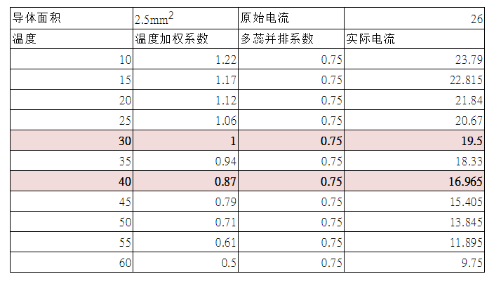“30度無氧銅導流量X溫度加權系數X多蕊并排系數=實際電流”