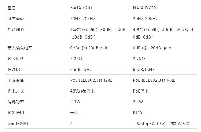 桌面鵝頸麥克風有模擬接口和Dante接口兩種型號可選,NAJA Y201、DY201是一款鵝頸麥克風,NAJA Y01支持模擬信號輸入,NAJA DY201是Dante網(wǎng)絡(luò)麥克風。