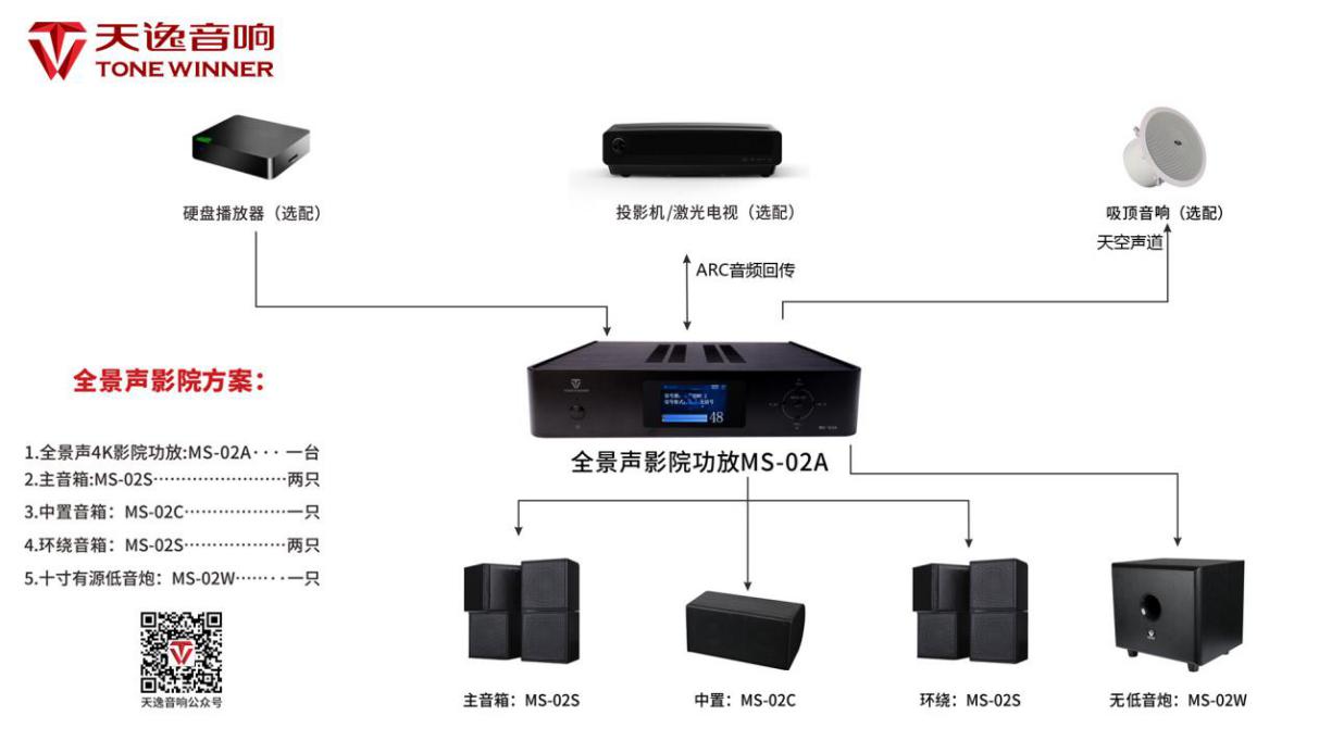 2.豪華VIP全景聲 高清影院房:天逸音響全景聲微影院功放:MS-02A;酒店客房、足浴、客廳等微影院專用5寸全頻音箱CS-50S套裝,酒店客房、足浴等微影院專用8寸無(wú)源低音炮MS-02W;