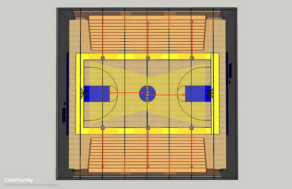 該系統(tǒng)設(shè)計(jì)模板描述了常見的學(xué)校籃球館的揚(yáng)聲器設(shè)計(jì)。兩種情況的主要區(qū)別在于它們在聲音上如何覆蓋場地。場地?fù)P聲器安裝在中心球場上方的位置。