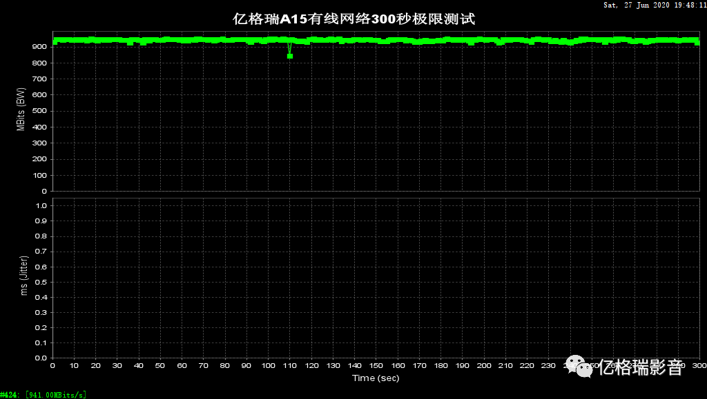 在300秒測試中,網(wǎng)絡穩(wěn)定性極好,300秒內的平均速度為941Mbps(118MB/S),發(fā)揮了94.1%的千兆網(wǎng)絡效能,相當完美。