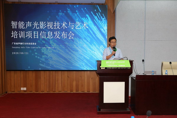 2020年8月21日上午,廣東省聲像燈光科技促進會在廣州國際專業燈光音響展覽會上召開智能聲光影視技術與藝術培訓項目信息發布會。會上正式啟動智能聲光影視技術與藝術系列培訓項目,且詳細介紹各項專業培訓課程內容,并進行商協會協同培訓簽約和冠名企業簽約儀式。